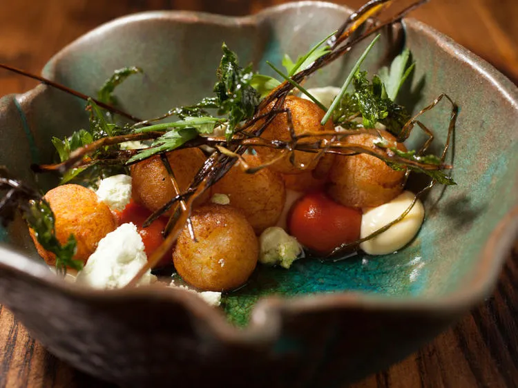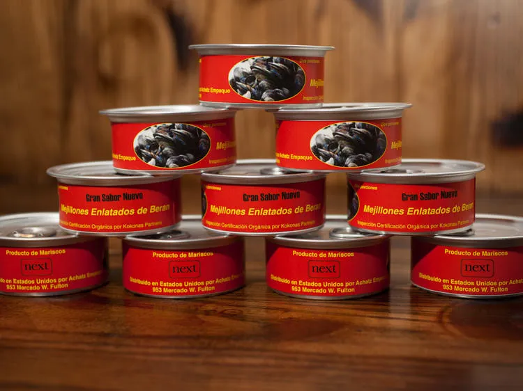 When you sit down at the table, there's a platter of cocas, little flatbreads piled with toppings, like anchovies and olives. Next comes a sealed red can, packed with mussels and labeled with the restaurant's name—it's a nod to the fantastic canned seafood that comes from Spain (seriously, if you haven't had the Ortiz canned tuna, right that wrong immediately) and one of the dishes that best sums up what eating in Spain is like. Later, there's a lovely rendition of patatas bravas, with tender spheres of potato and sauce, which you mix up yourself, as well as a plate of jamon iberico de bellota (the same kind of ham you'll see sitting on a ham stand at the entrance to the restaurant), sliced thin and arranged into a pinwheel, with fat that melts like butter in your mouth.
