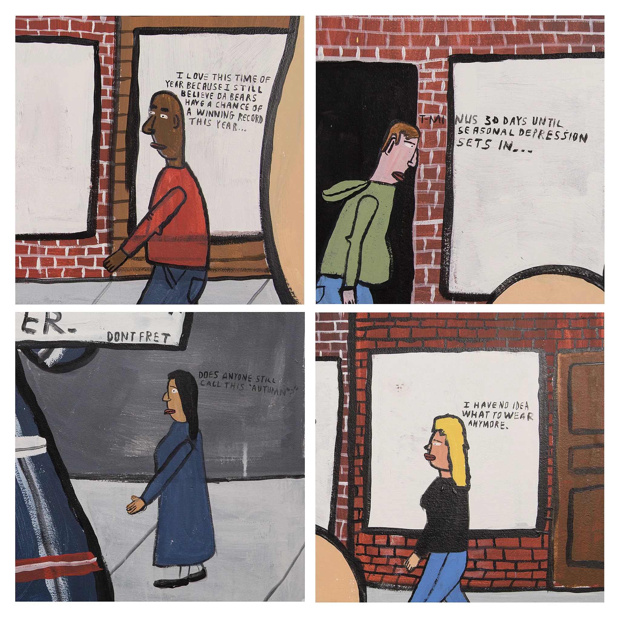 Don't Fret spent 10 hours painting his cover onto a Wicker Park wall before final touches were made, including a dose of Don’t Fret humor (someone simply cannot decide what to wear and seasonal depression is just around the corner, Chicago!). Our photo editor shot the living cover before the artist painted over the whole thing (a cool, bittersweet moment), the wall ready and waiting for a new piece of work—rapidly changing like the city Don’t Fret loves.