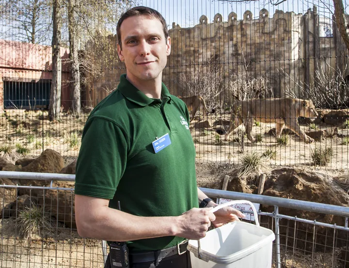 ‘We’re mainly working with the lions at the moment, so we start by giving them breakfast and cleaning the paddock. It’s important that they keep active, so we’ll lay scent trails, give them toys to fight with or tie their food to a special big-cat bungee cord, so when they grab the food it pulls back and they experience taking prey down. We spend a bit of time with each lion, but not too much because it’s important that they spend most of their day being lions.'