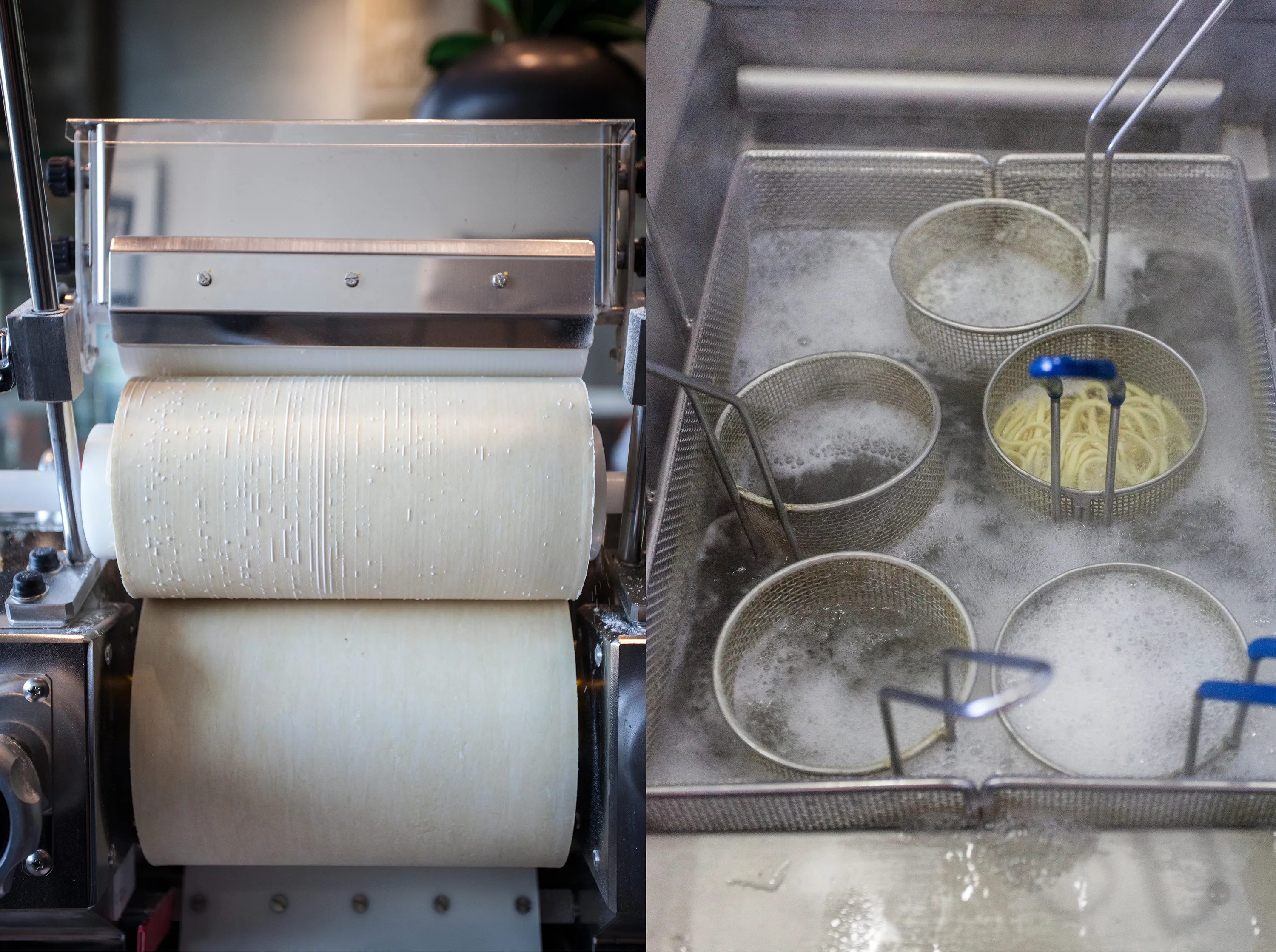 The dough mixes by machine for 10 minutes, but the kitchen always keeps an eye on the consistency. From there, the team repositions the dough into a set of rollers, which slowly cycles the mixture back and forth in an effort to flatten into sheets and sprinkles them with thin streaks of cornstarch to prevent sticking. “If it’s not perfect, we’ll do it a fifth time,” says co-owner Justin Lim. “It’s very tedious and time consuming, but the customer can tell the difference between fresh noodles and packaged noodles.” The packaged product of choice across the U.S. is Sun Noodle, a Hawaii-founded Japanese-noodle and wonton manufacturer that churns out roughly 230,000 servings per day—50,000 of which come from a facility in Compton.