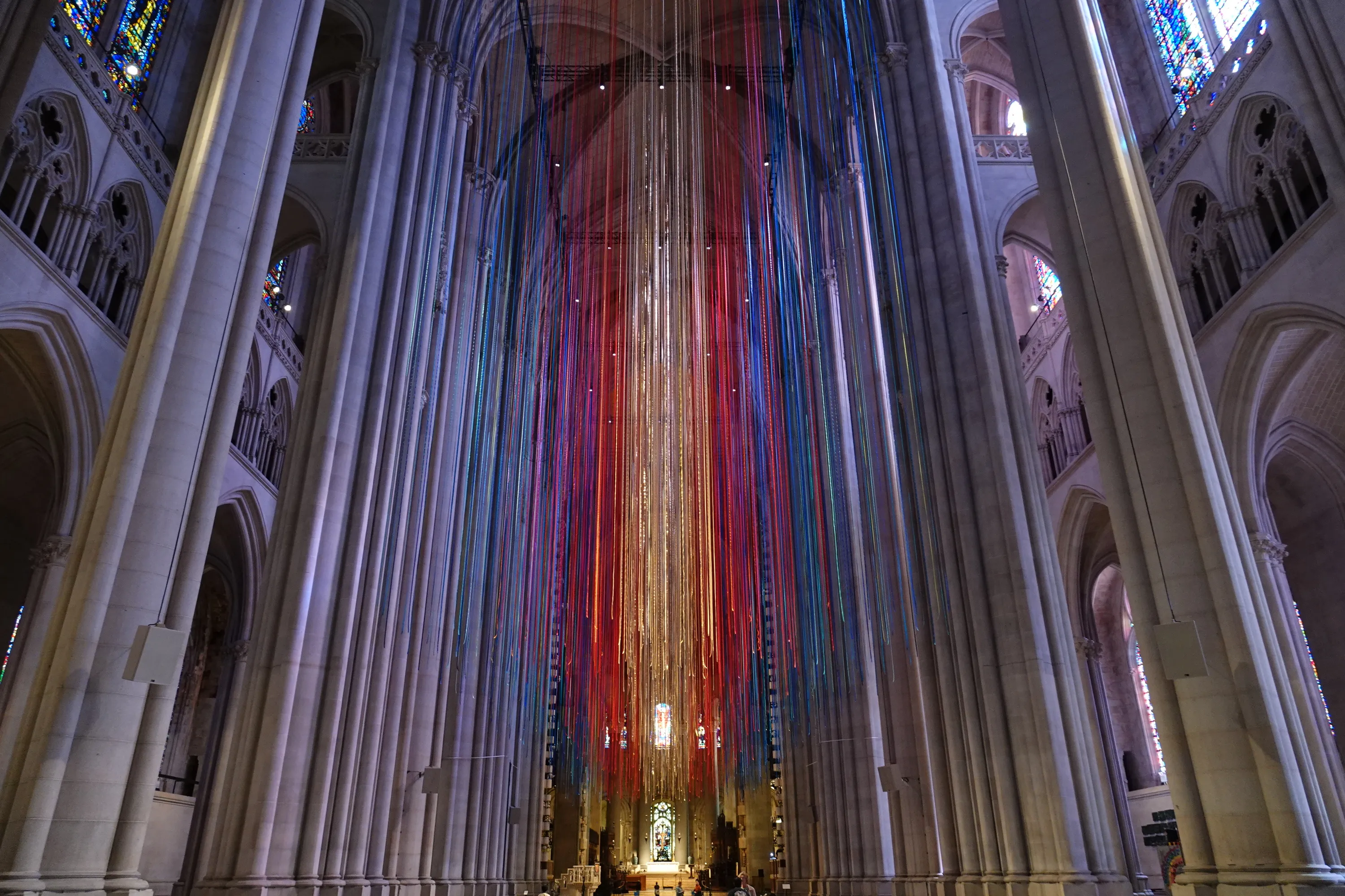 The beautiful artwork is also a feat of engineering. The ribbons are hung on a 120-foot by 30-foot aluminum truss frame and suspended approximately 90 feet above the floor of the nave of the cathedral. Steel cables extend through holes in the ceiling all the way up to the cathedral’s forêt (upper attic space) to support the structure. The site-specific piece is the largest the Brooklyn-based textile artist has created yet, joining her roster of stunning pieces.