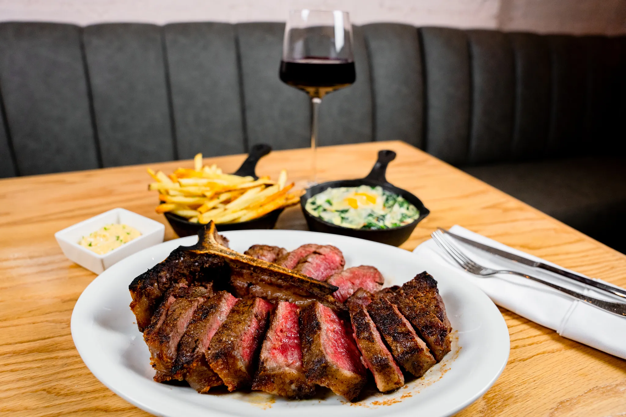 Executive Chef Alexander Lord-Flynn joins from the East Village French restaurant Jules Bistro, which closed during the pre-vaccine pandemic. Lord-Flynn was also previously the private chef at a Montana cattle ranch. Steak, of course, factors significantly into the opening menu, including an 8- or 10-ounce filet mignon, ribeye, New York strip and dry aged porterhouse for two. Classic steakhouse sides like mac and cheese (this one truffled), creamed spinach (turned carbonara with pancetta, parm and egg yolk) and a potato pavé piled with bacon, chives, gouda and jalapeño are also available.