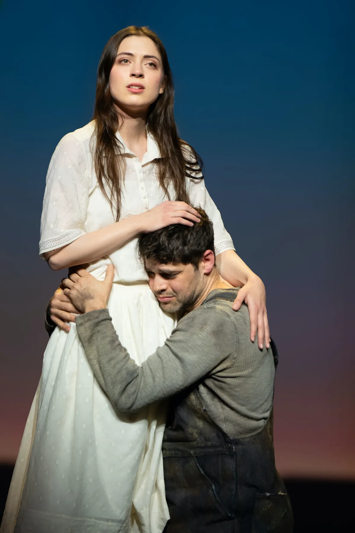The material reality of Floyd’s predicament may have felt more pressing in the cramped quarters of Playwrights Horizons in 1996 than it does in the wide open space of the Vivian Beaumont Theater, one of Broadway’s least confined venues. The set, by the design collective dots, is minimal—Scott Zielinski’s lighting accents the gritty textures of the floor—and Landau fills some of the emptiness with attractive stage pictures. (She’s partial to silhouettes.) In the main, however, this production’s pleasures are aural. It is perhaps most successful when approached as a staged recital of Guettel’s score. The orchestra, directed and conducted by Ted Sperling, is superb; so is the full-bodied singing by Jordan as Floyd and McAlpine as Nellie. (The latter is a young singer-songwriter with a voice that sounds truly special live, and her unpolished acting works fine for the character, who has recently left a mental institution.) The score has been fruitfully re-orchestrated by Bruce Coughlin, and is served beautifully by Dan Moses Schreier’s sound design, notably in an early song that incorporates echoes.