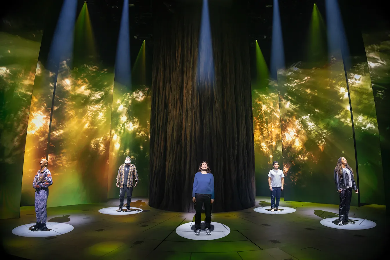 Where Redwood really shines is in the physical. As she proved with the underrated SpongeBob SquarePants, Landau has a fine sense for spectacle, and much of this show is lovely to look at. Hana S. Kim’s video design, rendered on tall and curved LED columns, has a vertiginous majesty, and the gigantic central tree, designed by Jason Ardizzone-West and lit by Scott Zielinsky, is a wonder. As in 2018’s unfortunate King Kong, the colossal title character of Redwood (which Jesse christens Stella) is the best thing about this musical, even though—or maybe because—it doesn’t sing. But arboreal splendor can’t compensate for the blandness that surrounds it. The show is all bark and no bite.