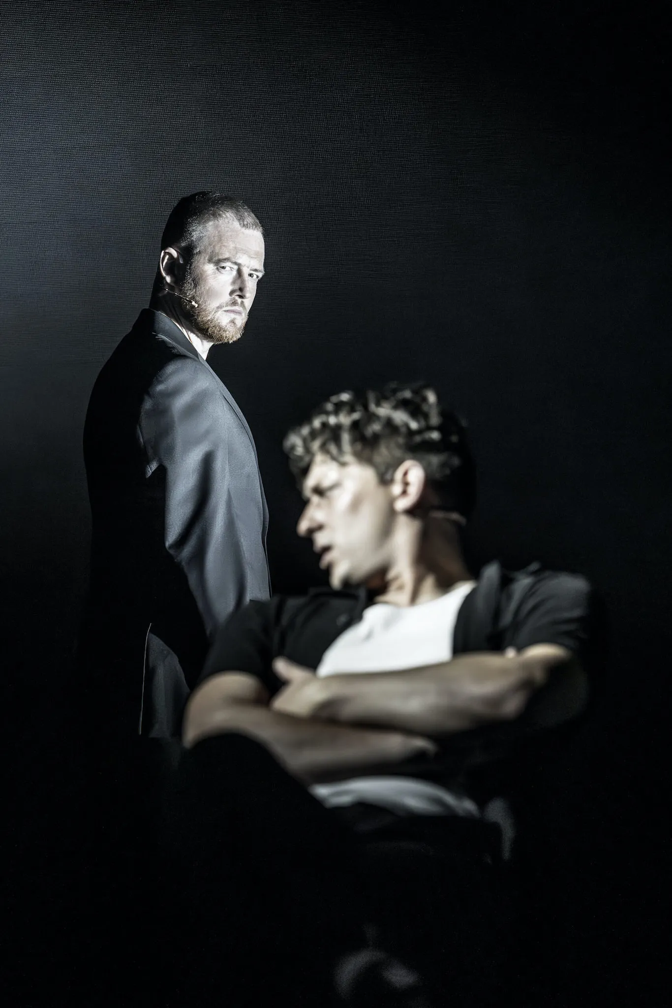 Thus described, Lloyd’s approach may sound academic—but in practice, it is often thrilling. The original production was famous for the lavish excess of its set and costumes. Here, by contrast, designer Soutra Gilmour’s set is mostly blank space, and she costumes the cast in basic modern black-and-white streetwear, sometimes with athletic socks pulled high. (When the ensemble performs Fabian Aloise’s sharp choreography, it looks a bit like an updated Gap ad.) Even Norma wears just a satiny black slip; this is Sunset, stripped. But you don’t miss the frills: Jack Knowles’s excellent lighting—and the video design by Nathan Amzi and Joe Ransom—fill out the scenes with ample film-noir atmospherics and help Lloyd shape the staging for maximum narrative and emotional impact. Not for nothing has the title been tightened to Sunset Blvd.