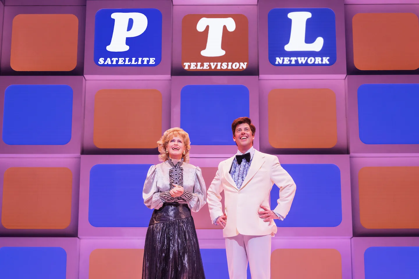 As in both film iterations of The Eyes of Tammy Faye, the musical emphasizes Tammy Faye’s loving approach to LGBT people, including a 1985 heart-to-heart with a gay and HIV-positive pastor. The production as a whole, directed by Rupert Goold, is suffused with campiness: the scenes in which Jim and Tammy Faye perform on TV are milked for showbiz cheese; the Pope, the Archbishop of Canterbury and the President of the LDS Church, in silly hairpieces, bicker and gossip on a party line; there is a running joke about the effeminacy of the actors performing Biblical epics at the Bakkers’ massive Christian theme park, Heritage U.S.A. (“Think of it like Disneyworld,” Jim says. “But for good people.”)