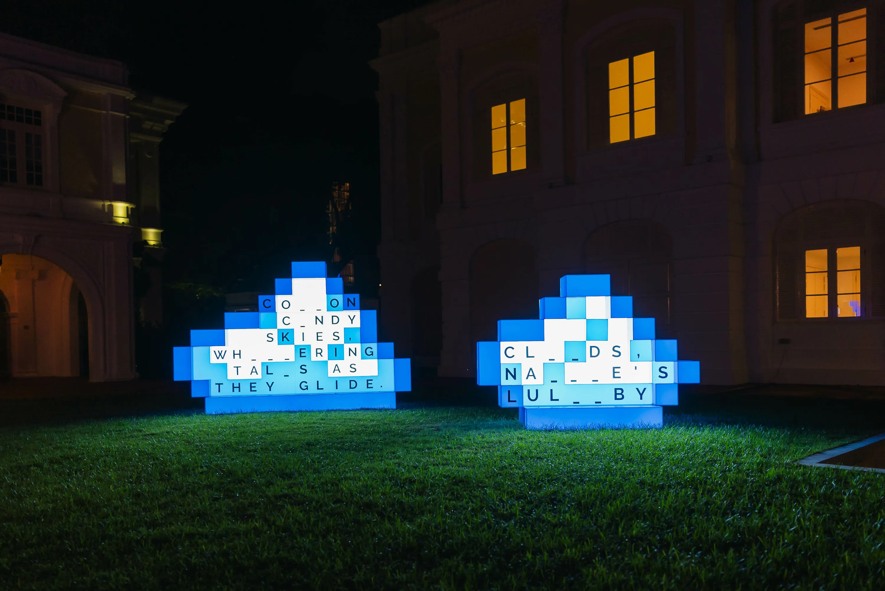 Embark on a scavenger hunt to find the missing alphabets that will complete Justin Loke’s 8-bit cloud poem. Loke’s work delves into the interplay between digital technology, words, and letters, drawing inspiration from the philosophical musings of Karl Popper in his essay On Clocks and Clouds. Within the pixelated blocks of the installation, a poem emerges with missing letters that are scattered across the Civic District’s six art benches.