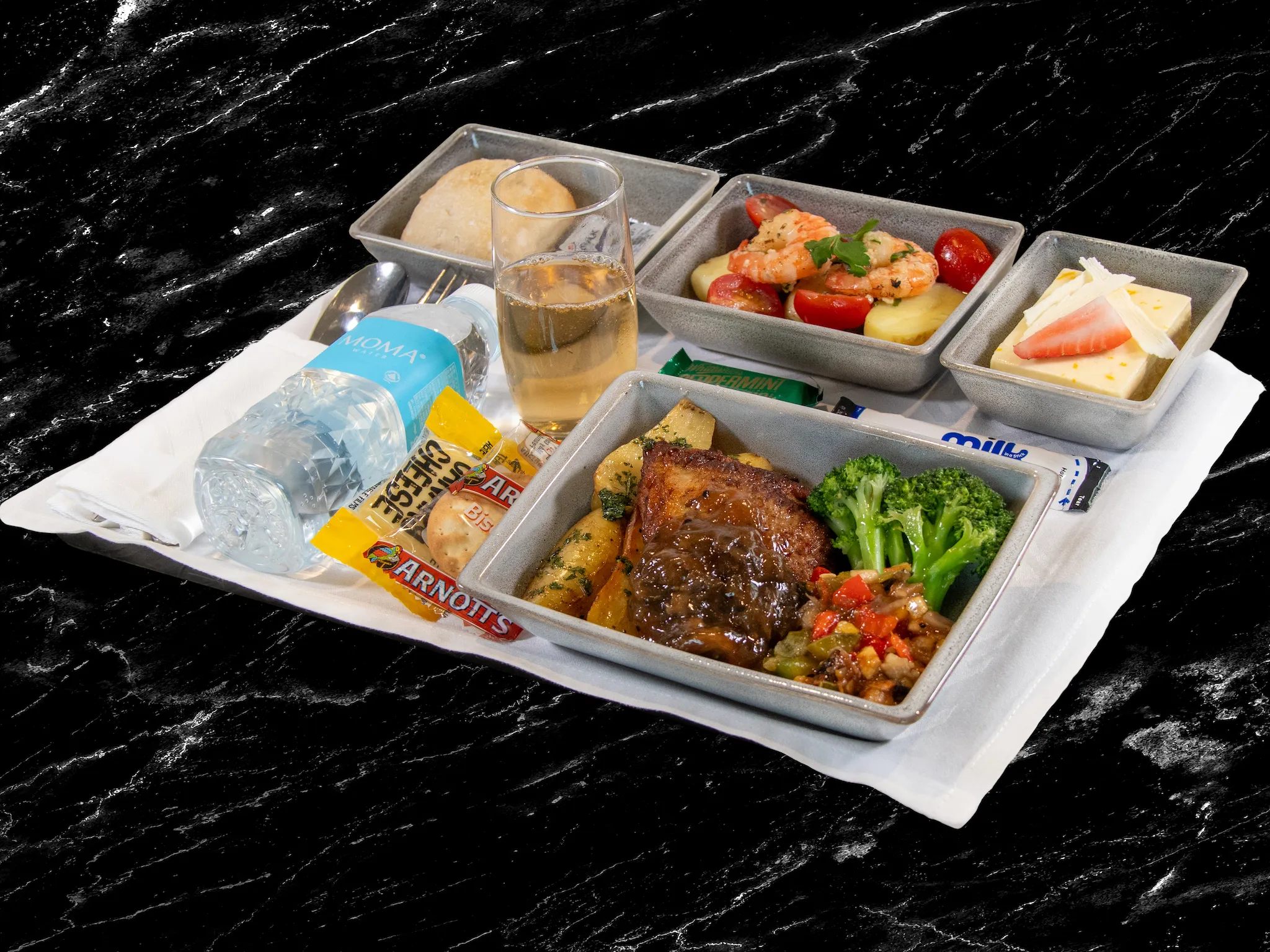 For dessert, dig into sweet treats like the chocolate feuilletine cake or apple crumble cheesecake. Every passenger will receive a small bar of chocolate and upgraded cheese and crackers. There are even upgraded bread options – think croissants for breakfast and garlic bread rolls for lunch, dinner, and supper.