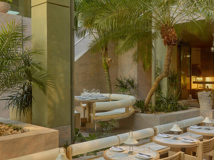 Entering the brutalist building, I immediately forgot I was in the middle of Brisbane’s CBD. The stunning 500-square-metre space is design firm J.AR Office’s take on the Gardens of Babylon, split across two breezy floors. It’s cool and calming, featuring soaring skylights, tiled surfaces, pink granite pillars and subtropical palm trees. I scored the best seats in the house (in my opinion) on the second-floor balcony, perfect for watching fellow diners enjoy their meals below. There was a mixed bag of guests, from gal groups to big families and corporate slaves, proving that this place really welcomes everyone.