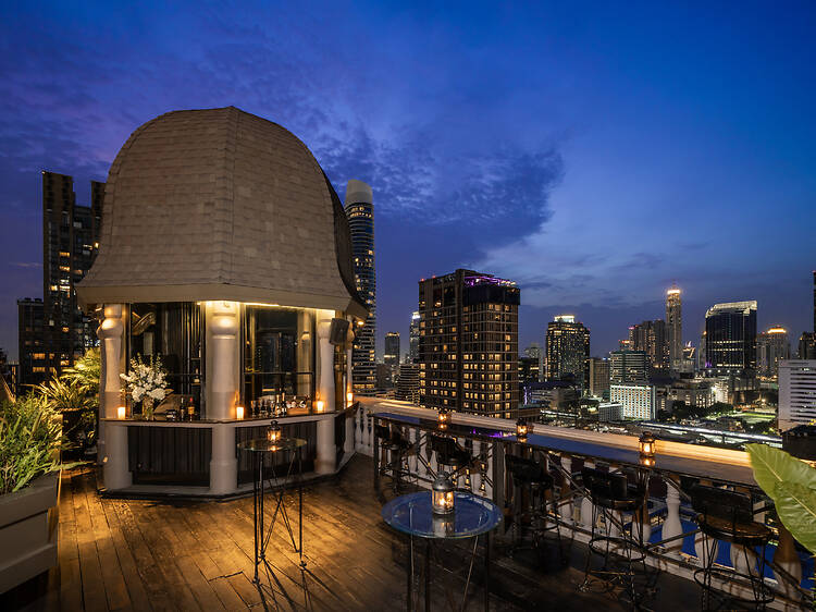 What is it: Two floors of rooftop character above the moneyed hush of Langsuan, The Speakeasy Rooftop Bar transports guests to a world of 1920s Prohibition-era glamour. Balancing between the 24th and 25th floors of Hotel Muse Bangkok, the concept threads together two stories: the travels of King Rama V through Paris, London, Berlin, Rome and tributes to the golden age of travel. Up top, a glowing golden dome crowns offering 360-degree panoramic views of the Bangkok skyline. One floor down, the Blind Pig Cigar Lounge does the opposite – dark, close and smugly cosy.