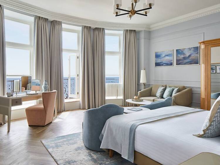 The hotel is perched on the Brighton seafront, of course, which means you’re about 50 yards from prime beach real estate in the summer and nicely placed for a gusty promenade in the winter. The Grand sits at the foot of West Street, the main thoroughfare that leads up to the station, and only a short hop from The Lanes, that maze of antique shops, boutiques, pubs and cafés. The pier is a 10-minutes walk away, if you’re in the mood for the dodgems.