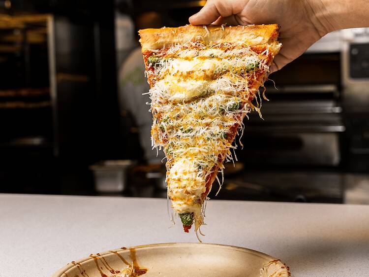 At Kalis, pizza is sold exclusively by the slice, as New York tradition dictates. The slices are thin, nicely crisp on the outside and juicy in the center, meant to be eaten hot, standing up, at the counter—capturing the urban spirit of the classic slice shop.