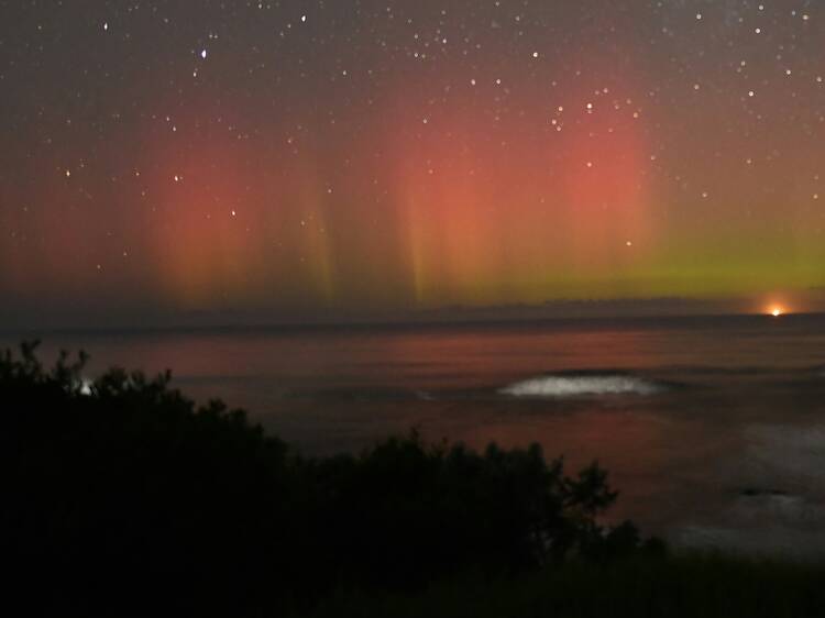 The aurora is most active near the Earth’s poles, so face due south and keep your eyes low on the horizon. Look for faint bands or a subtle red/green ‘glow’ above the horizon. Sadly, you won’t see dramatic curtains of light overhead.