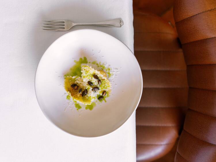 Start with a cocktail or a glass of bubbles, if only to give yourself time to properly peruse the wine list. It’s a compact selection, but features a wonderfully diverse collection of labels and producers, many of which are almost impossible to find.