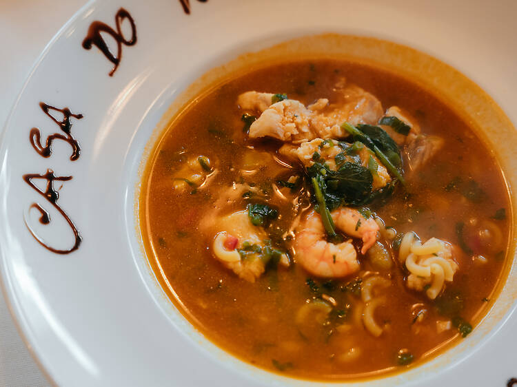 For fish dishes, two soups that have accompanied him for decades stand out: the rich seafood soup (€48 for two people), which here gained a new name because of its proximity to Parede beach, and the grouper broth with clams (€28), created by his mother, with spinach to cut through the richness and a scent of the sea. It is “his rabbit out of the hat”: “When I realise people are looking for something different, with great quality and a natural aroma, this is the dish I always recommend.” For meat, the hare in a pot with white beans (€26) arrives marinated, with bacon, linguiça and fresh beans.