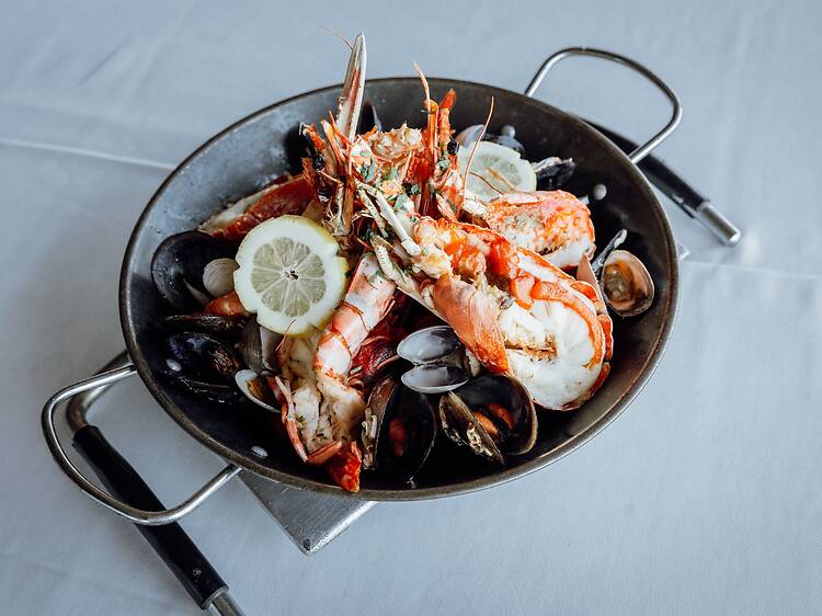 Among the highlights, there are classics as well as dishes with more contemporary or international influences. The lobster crêpes (€28.50), although an unusual way of serving the crustacean, are described as “something very typical of this house”, while goose barnacles (€16.75 small; €23.45 medium; €33.50 large) reinforce the direct connection to the Atlantic. These are joined by lobster cream soup (€10.50), seafood salad (€29.50) and the seafood platter (€99, for two people), one of the most requested dishes. Among the mains, the octopus cataplana with sweet potato (€27.50) stands out — “personally, it’s my favourite,” admits Miguel Ramos.