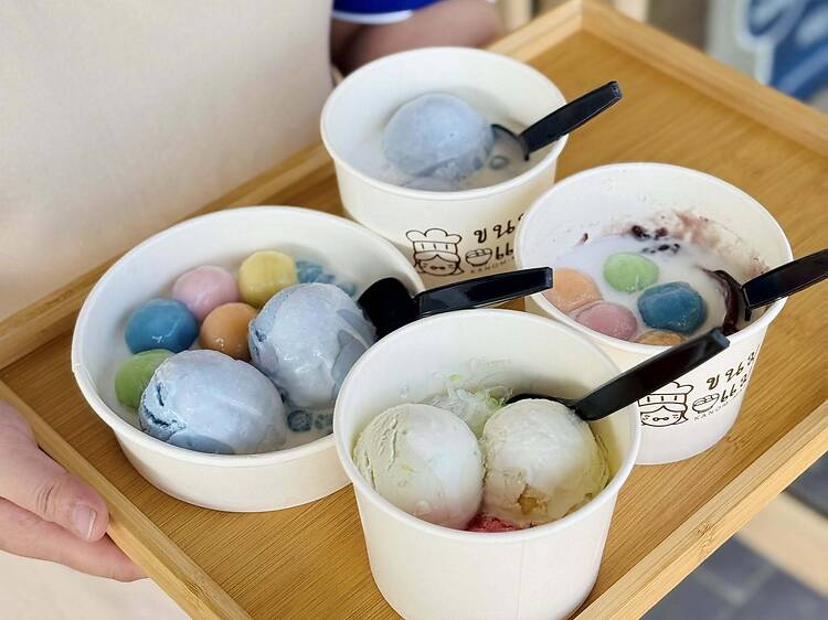 Alongside the classic version, there are variations that push things further. Oversized bua loy come stuffed with fresh coconut, adding a richer bite, while others are paired with coconut ice cream in flavours like taro or butterfly pea. The mix of temperatures and textures, warm coconut milk against cold, creamy scoops, keeps things interesting without losing that familiar comfort.