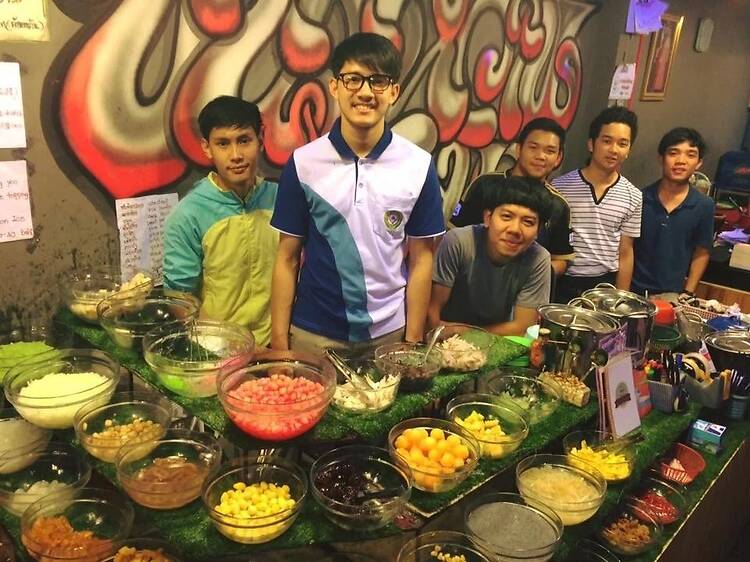Right on busy Chang Moi Road, this long-running evening dessert spot is all about tradition and consistency. The setup is simple, with a vast and vibrant spread of Thai dessert toppings laid out at the counter. You then make your selection and build on the familiar trio of coconut milk, palm sugar and rice in its many forms. You’ll find everything from sticky rice variations to soft custards and jelly-like sweets, each one made fresh. Filled with locals, it feels rooted in everyday Chiang Mai life, reliable, unpretentious and always satisfying, whether you’re grabbing a quick bowl or picking up a few things to take home.