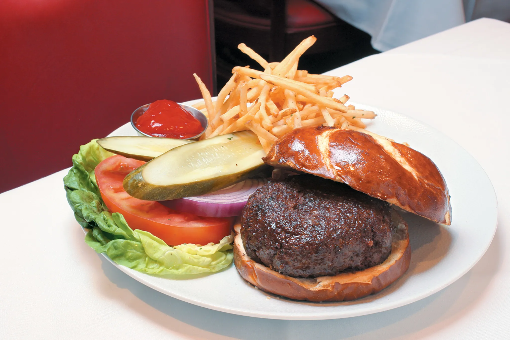 7. Rosebud Burger at Rosebud Steakhouse: A simple inch-thick patty is layered with two slightly charred slices of lettuce, tomato and pickles, all bookended with a toasted brioche bun.