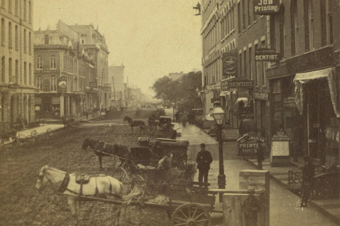 Ah, Chicago before the fire. The city was very different—a nexus between the industrial East and the agricultural West, full of opportunity. It grew like a weed, and in order to keep up, the city was made mostly of lumber. Wood covered the streets and sidewalks, and since the steel revolution hadn't caught on yet, many of the buildings were, yes, also wooden. This photo of Washington Street looking west from Dearborn Street is a good example of what Chicago looked like back then. Carriages sat on muddy roads by wooden boards and gaslights, just asking to catch fire—and that's exactly what happened in 1871.