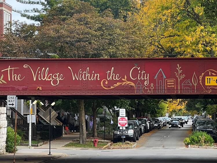 A painted viaduct over Roscoe Street that reads "The Village Within the City."