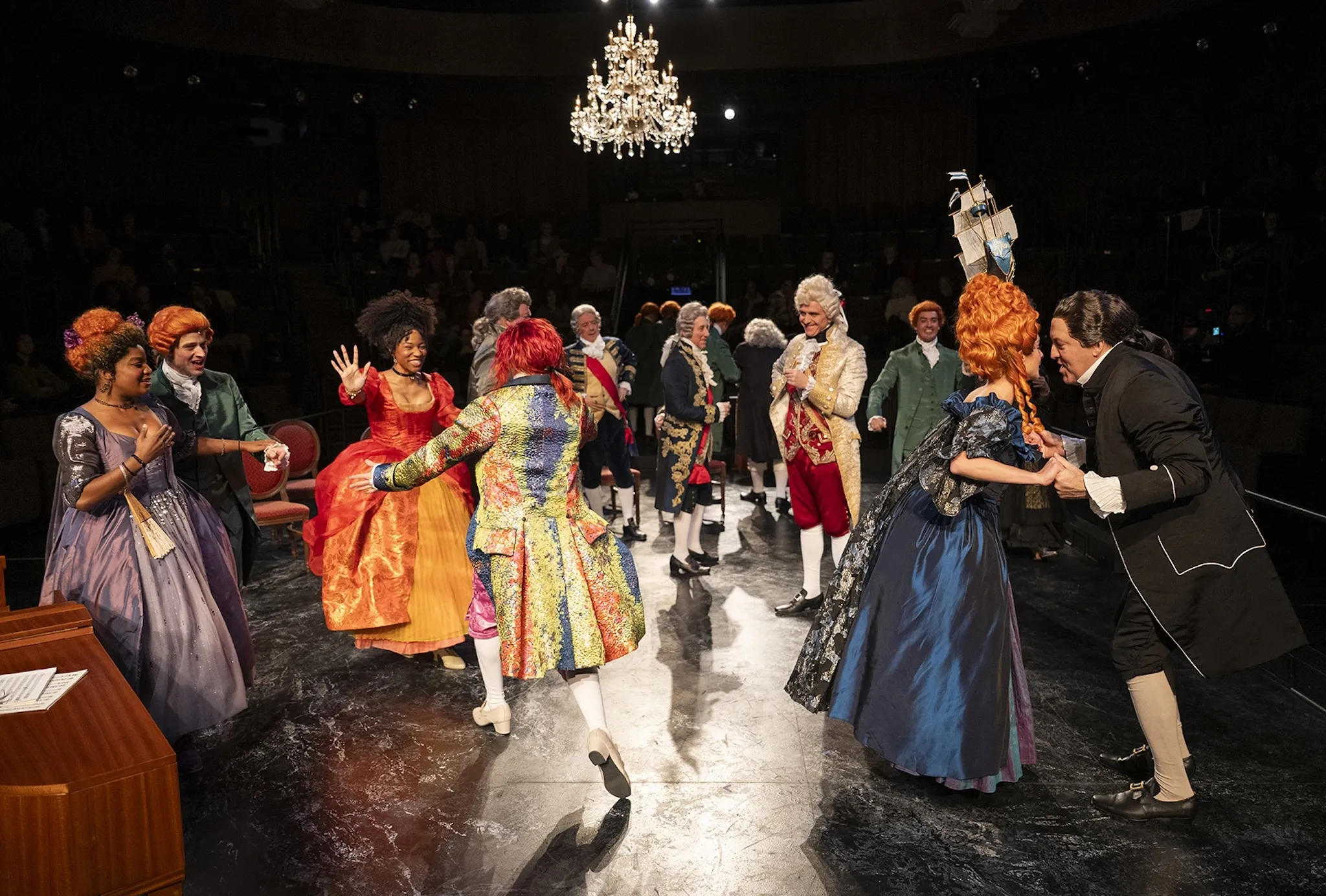 That sun is played by David Darrow, whose Mozart radiates an irresistible, maddening charm. Darrow leans into the character’s impish, sophomoric humor; his magenta hair and gilded coats telegraph a man intoxicated by his own whims. He speaks in lightning-fast allegro, in words that hurtle like a freight train while staying startlingly precise. But it’s in the fleeting moments when Darrow, himself a composer, sits at the keyboard that he fully captures Mozart’s transcendence. Suddenly, we understand the awe, and the terror, he inspires in Salieri. “My tongue is stupid, but my heart isn’t,” Mozart declares. It’s the only truth clear enough to cleave through the chaos around him.
