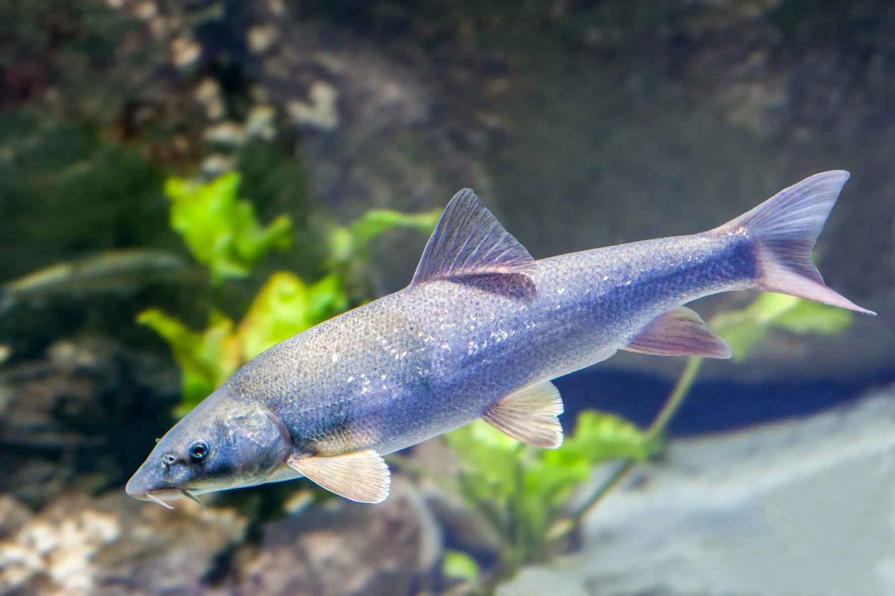 Graylings are the next kind of fish to appear on your route, feeding on invertebrates that live around the sparse plant life, rocks and natural detritus that occurs here. Then, the number of species explodes in variety as we enter the region most populated by river fish, the water temperature having risen considerably since the earliest tanks, the oxygen levels having plummeted and the waters more calm. Such conditions enable the growth of algae and fungi, creating a bountiful feeding environment for fish and you can see chub, asp, nase, vimba, bleak and loaches in these tanks, swimming in waters which have a sand and gravel bottom.