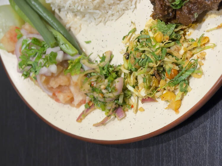 For the Manipuri thali, I went with the duck curry. It came with four sides: sinju (a salad with a tangy, spicy dressing made from roasted red chillies, fermented fish (ngari), gram flour and roasted perilla seeds or sesame), eromba (a chutney of bamboo shoot, potatoes, tomato, fermented fish and chillies), boiled vegetables and dal. It’s a bold, spice-forward plate with fermented flavours that doesn’t soften for unfamiliar palates. To finish, there’s heimang tea (sumac berry), tangy like tamarind, which I was told helps digest the meal.
