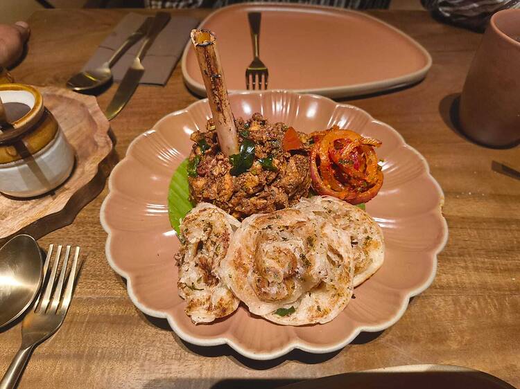 Speaking of which, I could recommend specific cocktails and coffees from the bar, but your honest best bet is to ask the waiters what would go best with your choice of food. The range is not a joke here. Two other dishes we tried and loved: the ‘Russel Market’ raan – Chettinad-spiced goat and parotta, inspired by the over-hundred-year-old namesake market in Bengaluru – and the Bengaluru military donne, a regional biryani born from the iconic several military hotels in the city. Clearly, a tremendous amount of thought has gone into the list of dishes. Even if I had to be an obscene amount of critical, any complaint would be mitigated by one of their chutneys on hand (in my case, a pineapple one).