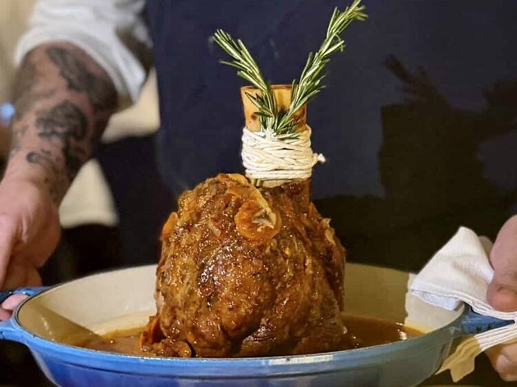 Sorti droit de l’ardoise lui aussi, le jarret de veau à la jambe de bois, hommage au chef Nicolas Jongleux, se présente en tranches épaisses, surmontées d’un vibrant — et nécessaire – chimichurri. Le jus est riche, complexe… Et puis si on criait pour de la fraîcheur en accompagnement, voilà qu’on nous dépose des tripes à la sauce tomate que McMillan enjolive précisément de trois beaux filets d’anchois, pour sa morsure saline.