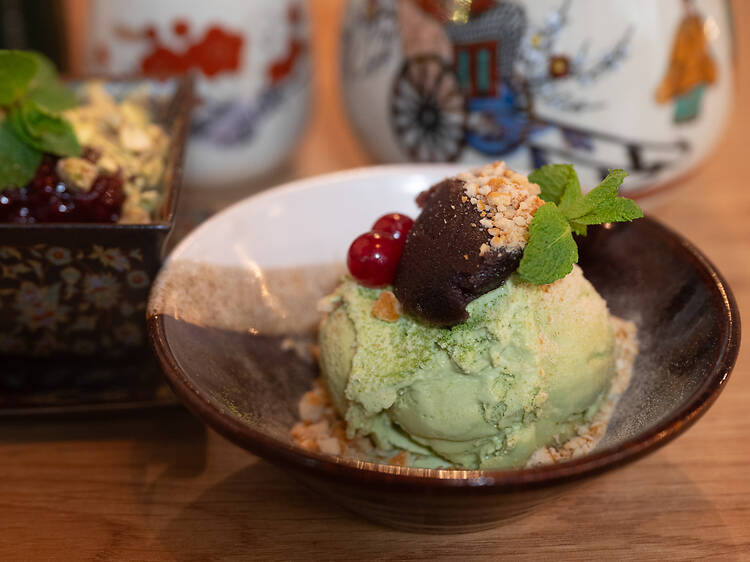 Save room for dessert. The matcha ice cream with anko (red bean paste) is simple but spot-on, while a chocolate pudding topped with roasted pistachios quietly steals the show.
