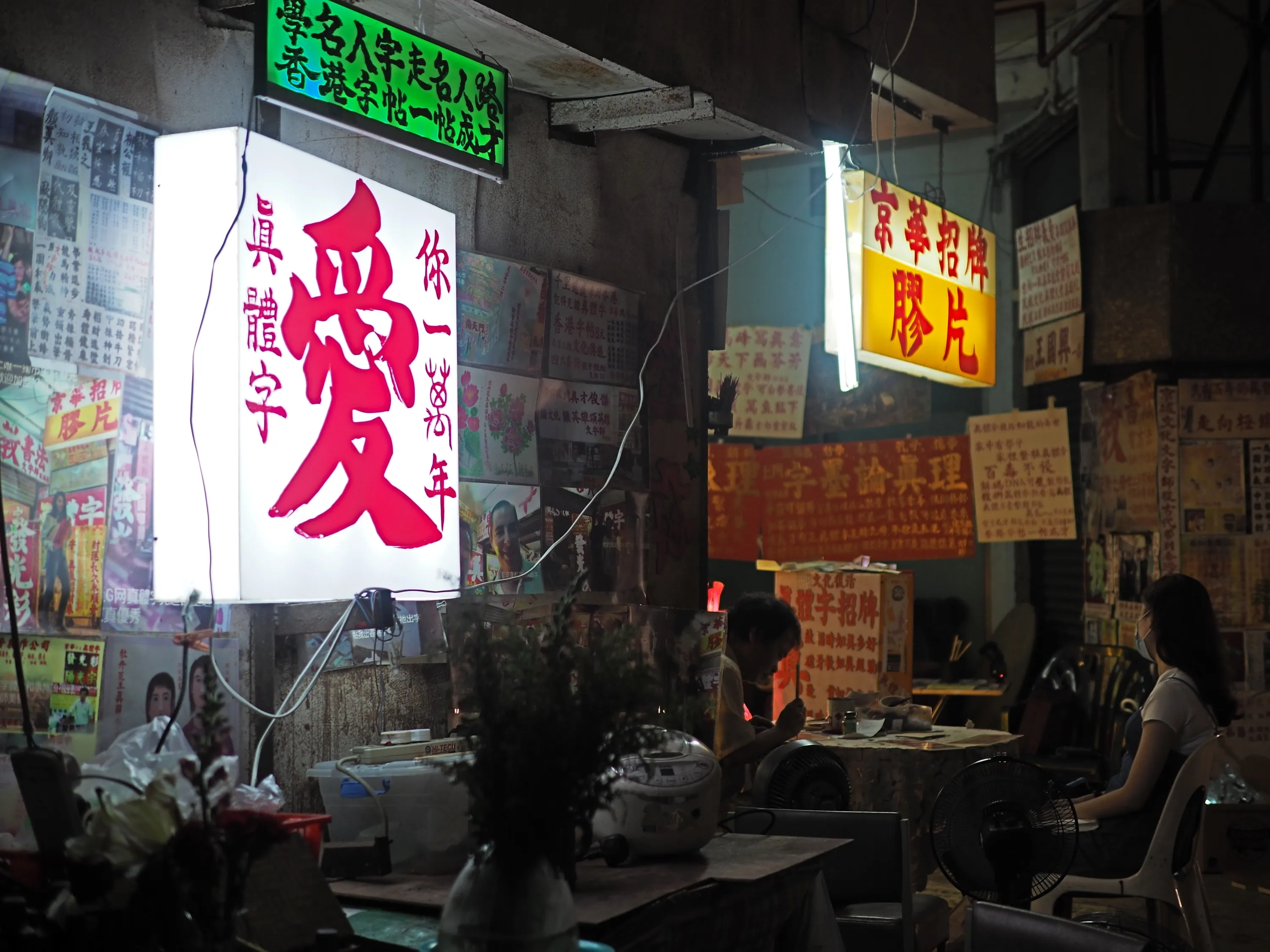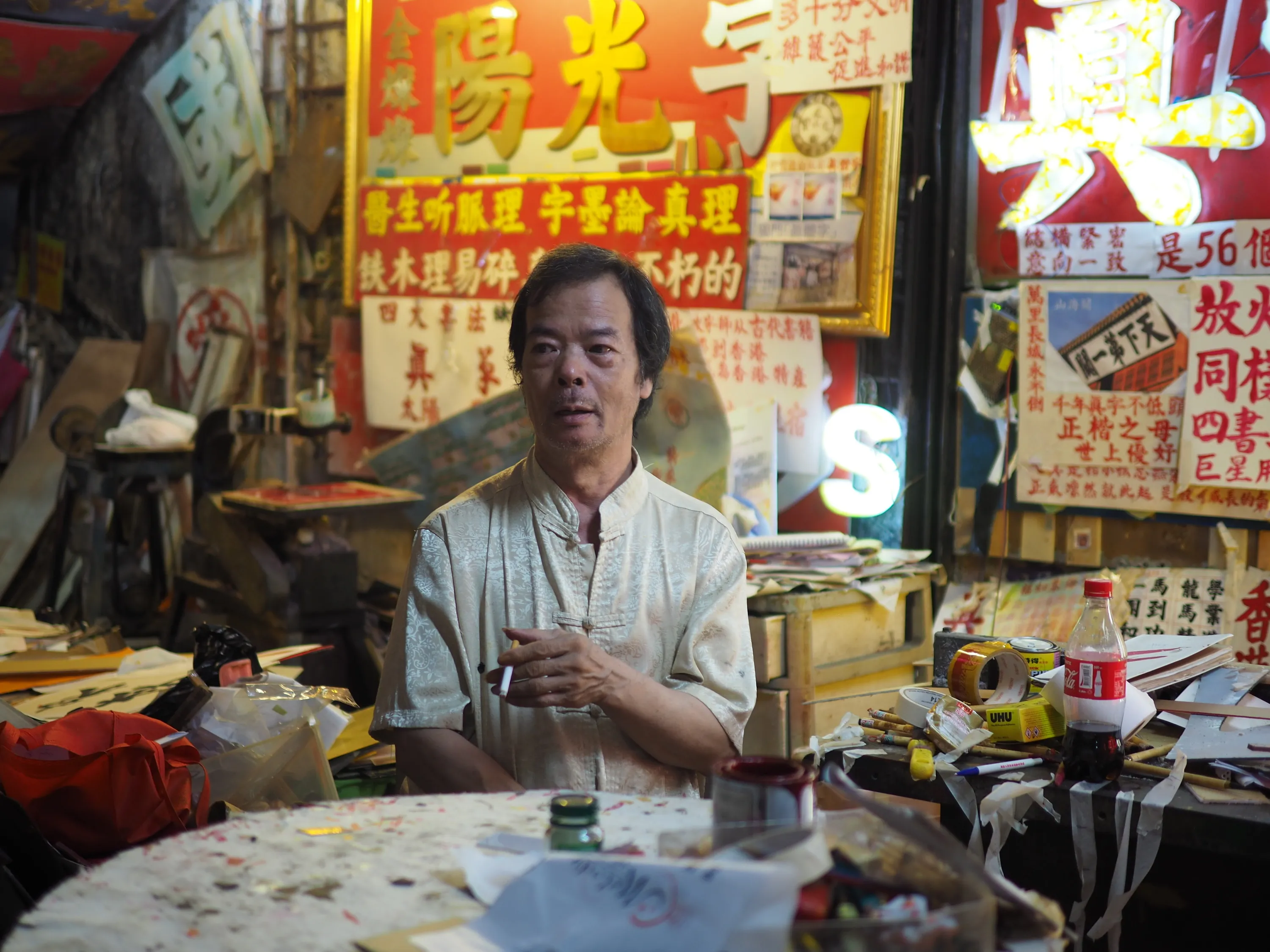 Once a landmark and the glory of North Point, the 68-year-old State Theatre Building is the kind of place that would give you goosebumps the moment you step into the building. Clouded in an eerie atmosphere throughout the premises – most likely due to the vast empty spaces, vacant shops, and sounds of reverberating water leakage – the dimly lit building is a jarring contrast to the bustling streets of the North Point neighbourhood. If you walk further into the building, you'll spot the two remaining tenants tucked in the back, one being a traditional tailor shop, and the other surrounded by lit-up signboards and plastic signs, which is where Au Yeung Cheong and his shop King Wah Signboards (京華招牌) resides.
