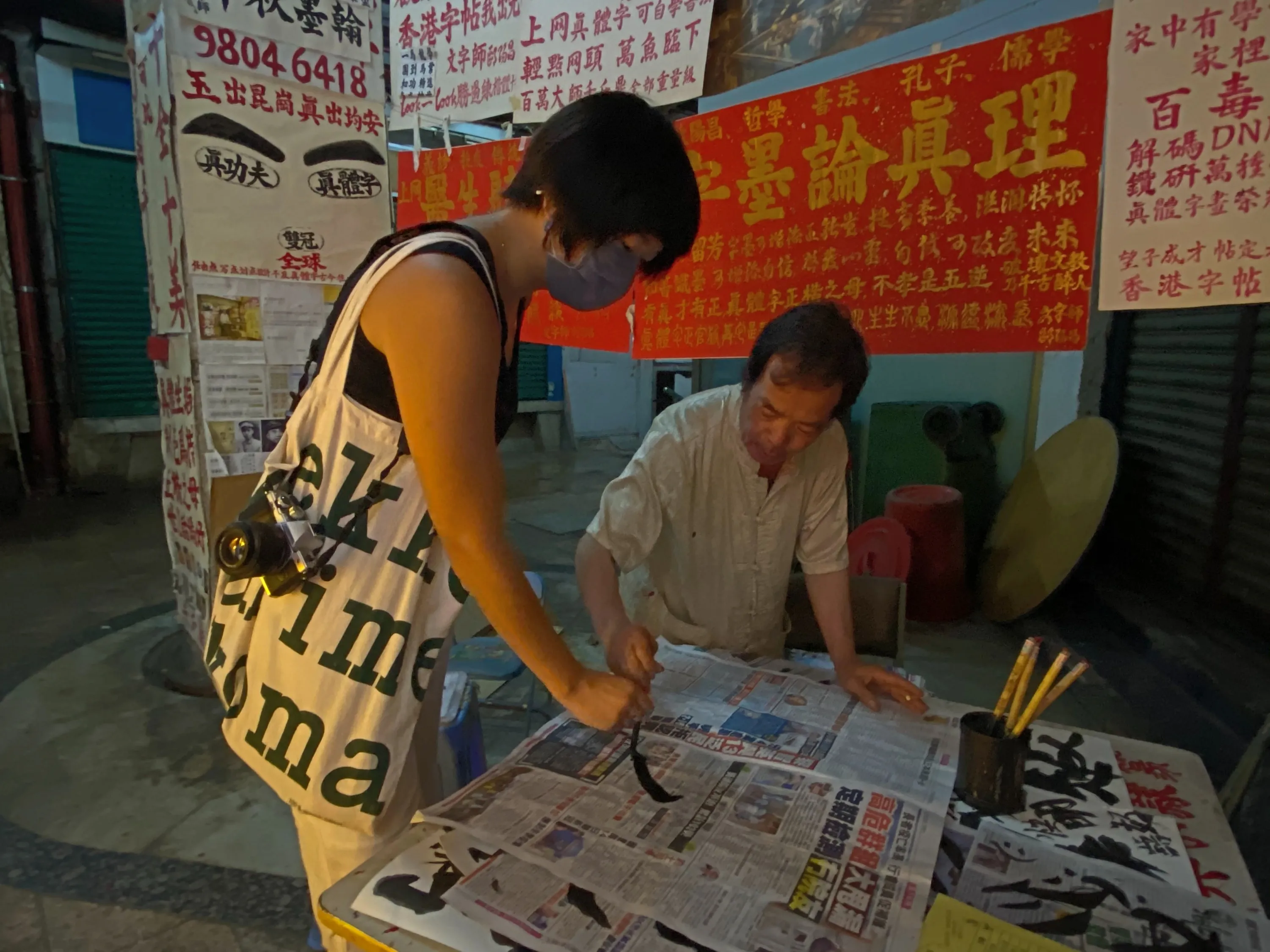 Business was slow during our visit. Au Yeung was writing three signs for only one customer, with words and phrases of her choice, charging $400 altogether. In between intricate strokes made with red ink and no hesitation, he tried to keep the conversation going between us and his customer, even sharing snippets of his work, paintings he did during his free time, and photographs he took with his customers (he often asks his customer to take a photo with him as a keepsake).