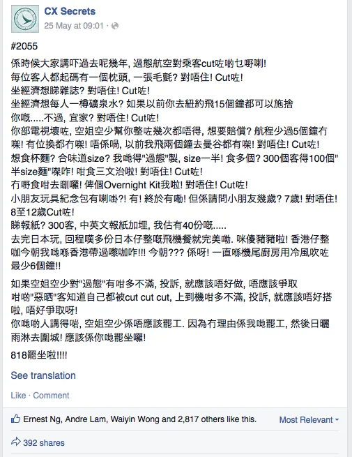 CX Secrets is a page purportedly hosting anonymous posts from Cathay staff. This recent post [http://on.fb.me/1LHVr3X] was picked up by The Stand Newsand corroborated by them with current staff.