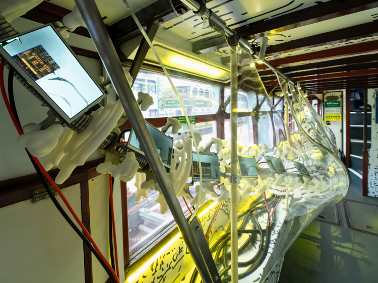 Ascending to the upper deck, passengers are treated to a multi-sensory experience with the video work, The Vitiligo – The Absence of Green. Set in 2066, this installation imagines a world where trams are replaced by sentient AI systems, and the iconic Hong Kong tram shade of green no longer exists – that is, until Tram0, revealed to be an AI tram prototype, discovers its grandmother’s diary of green and embarks on a quest to rediscover this lost colour. The installation explores connections between hard data and intangible memory, and how unravelling layers of heritage can shake one’s identity – just as it did Tram0’s.