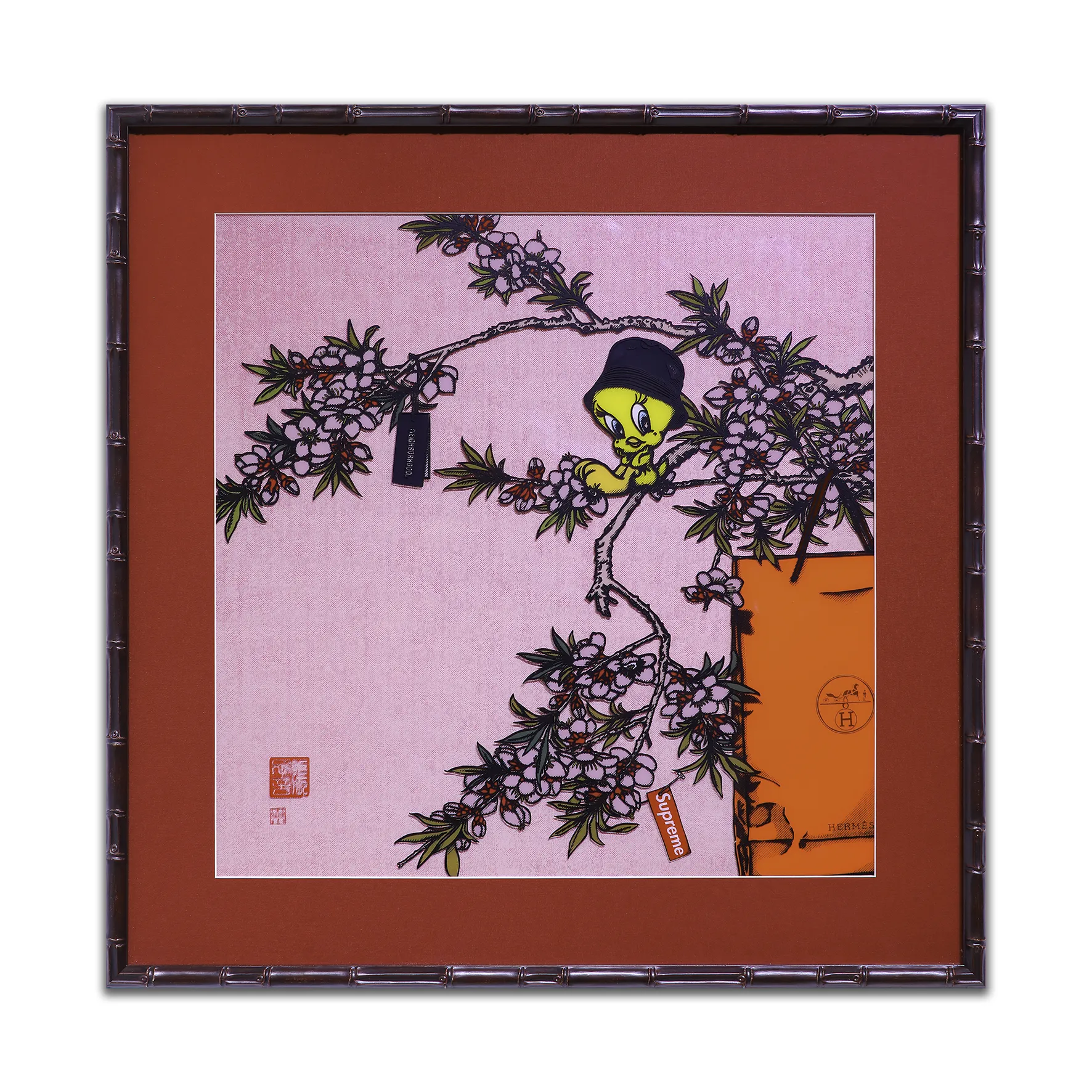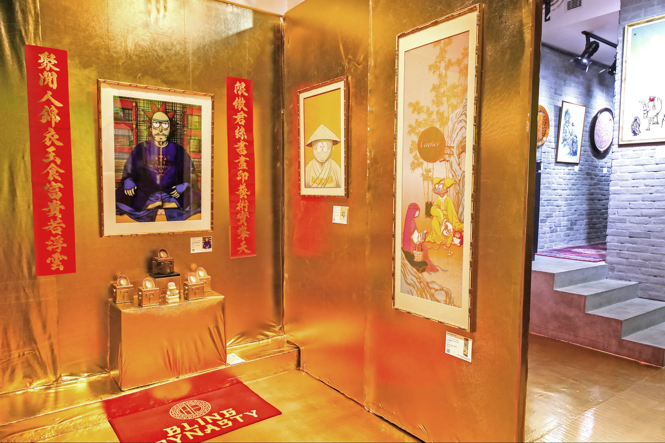Titled Bling Dynasty, the exhibition features a series of new artworks created using techniques inspired by Western and Chinese art and handicraft traditions, including silkscreen prints on plexiglass, resin and bronze sculptures, as well as traditional embroidery and calligraphy. Drawing visual references from beloved animation and gaming titles such as South Park, Family Guy, and Rick and Morty – along with iconic logos from luxury fashion houses – Ernest fuses his characteristic pop art style into recognisable iconography from Tang and Han Dynasty paintings.