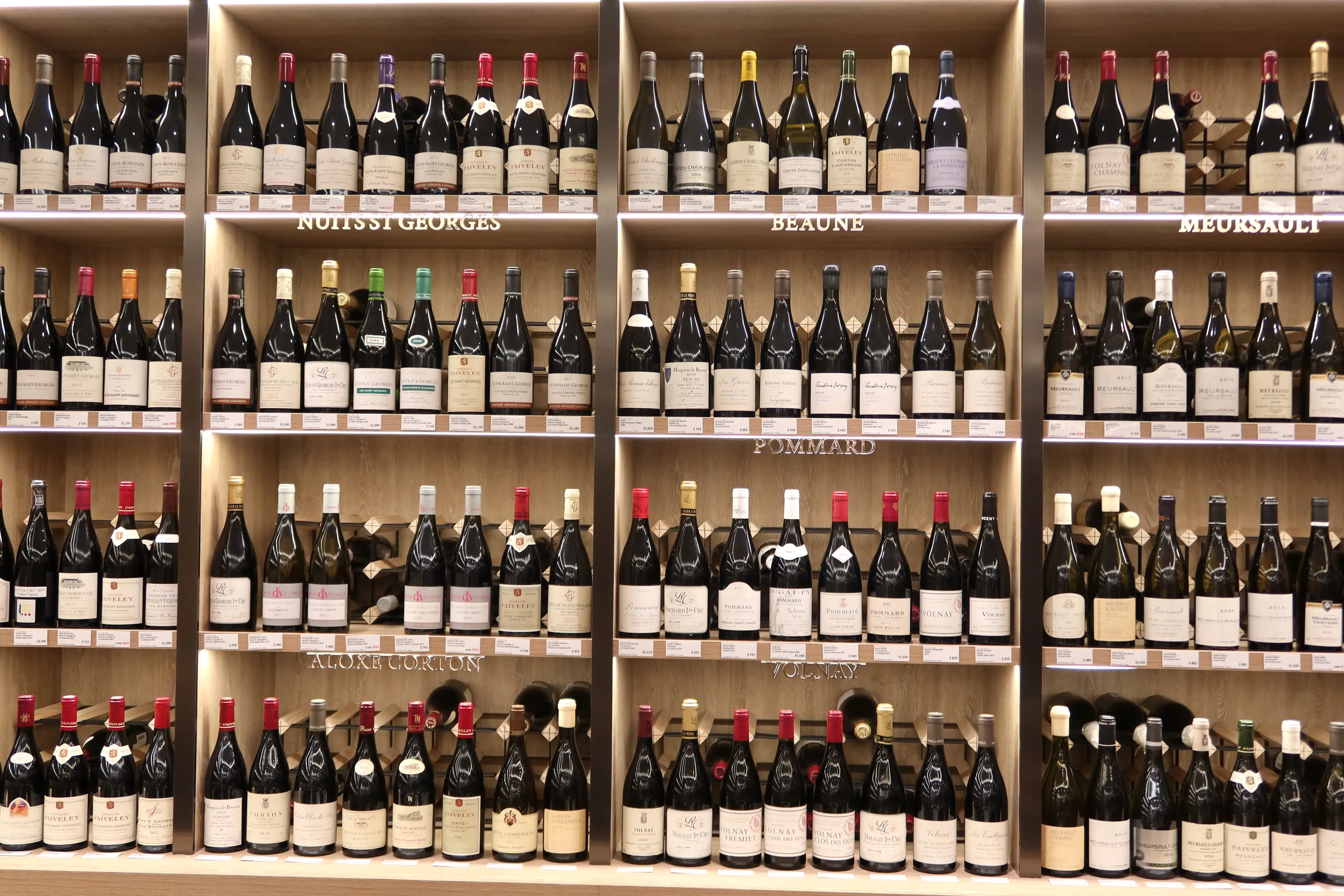Burgundy wines are divided on the shelves per appellation which include Aloxe-Corton, Chambolle-Musigny, Gevrey-Chambertin, Chassagne-Montrachet, Santenay, Meursault, Puligny-Montrachet, St. Aubin, Volnay, Pommard, Beaune, among others.