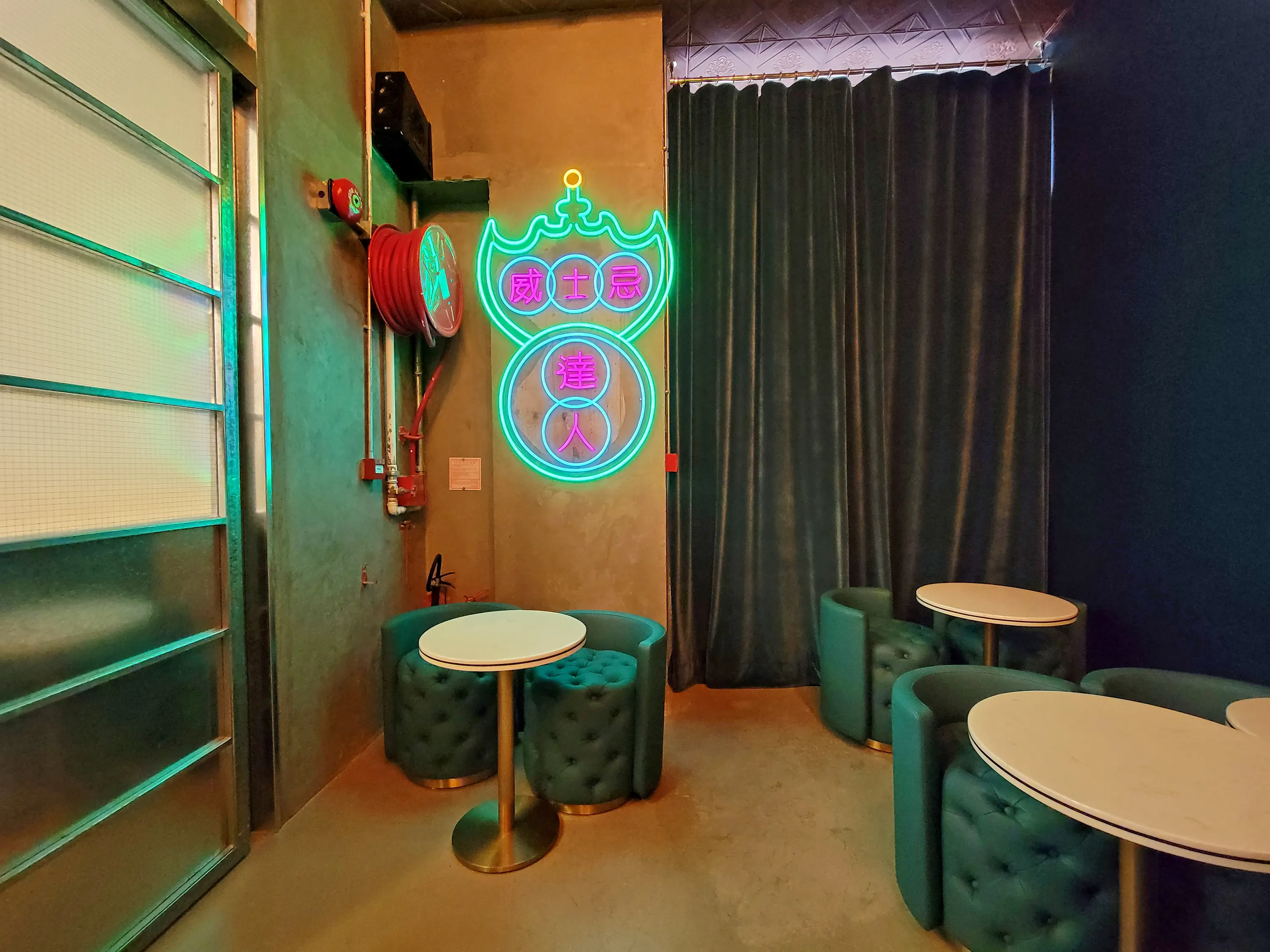 The bar's entrance is a frosted glass door hidden at the back of the cafe. There are no magical passwords or any button you need to press. Any curious cafe customers are welcome to enter the 16-seater bar. Aiming to target a younger audience, the bar's interior veers away from the sleek, classic gentleman's leather den design that is often the look of whisky bars in Hong Kong. What you’ll see instead is an industrial interior with plush pine green furnishing in contrast to the room’s exposed concrete walls, pipes, and fire hose reel. The only source of light are a few bulbs on the tiled ceiling, the backlit bar – that draws your eyes to the whisky bottles – and a cast of green light coming from the neon-lit signage resembling a traditional pawnshop emblem with words 'whisky expert' written in Cantonese.