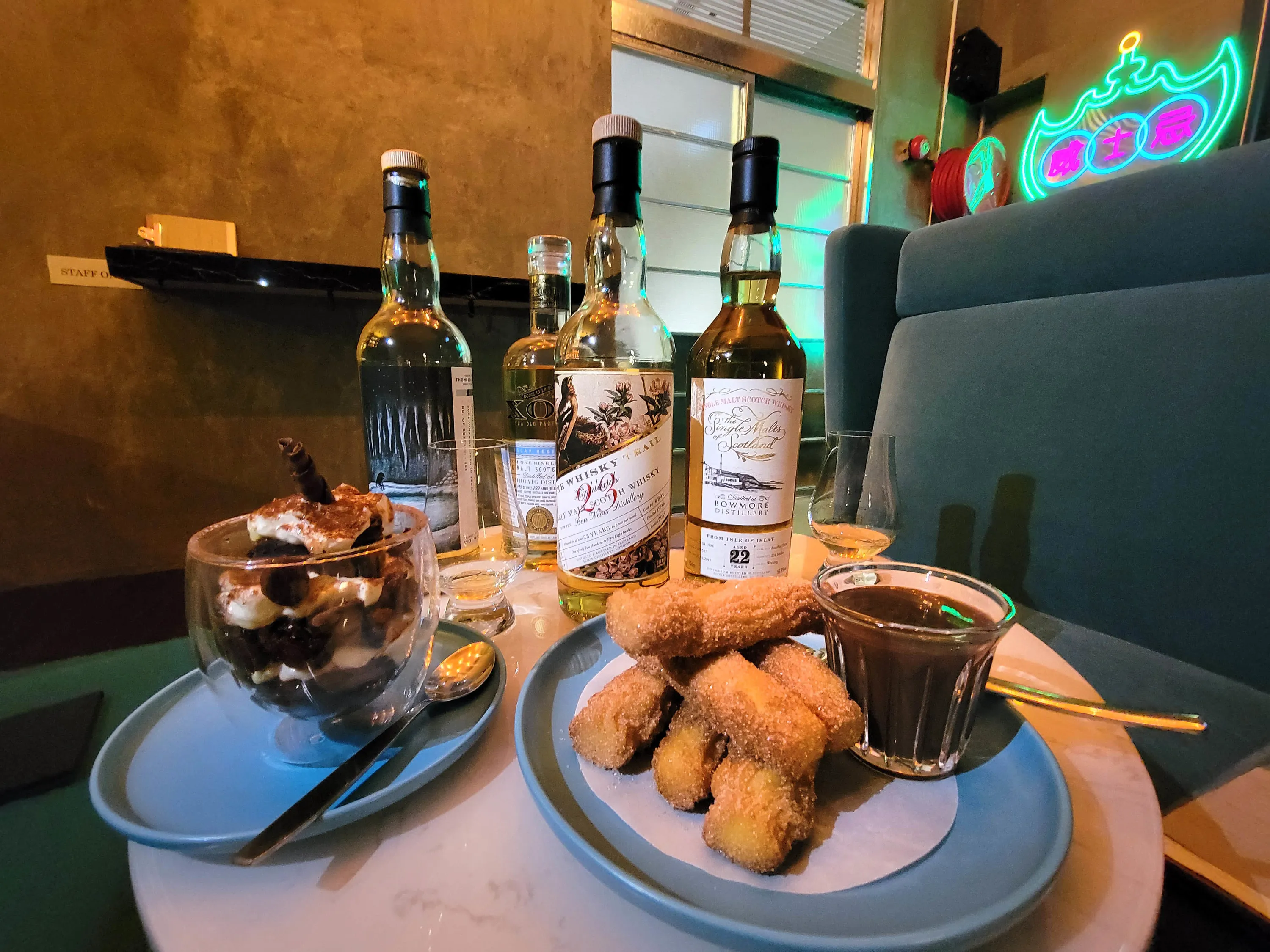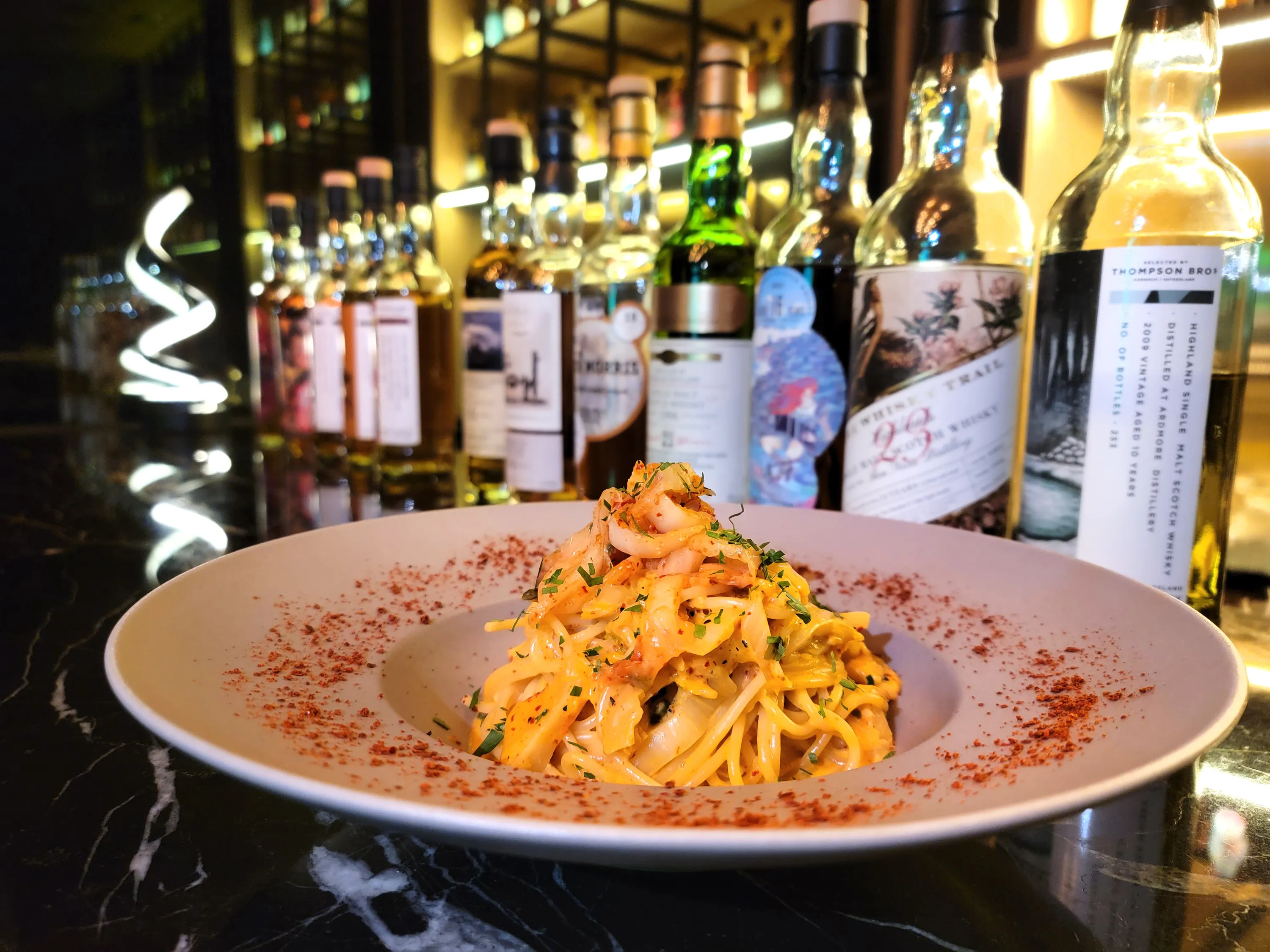 The menu features over 30 bottles of Scotch from Speyside, Highland, Islay, and Lowland regions which can be tasted in three flight selections (Novice $248, Experience $398, Expert $498; whisky may change depending on bottle availability) or as 30ml single drams (from $80 to $520 depending on the bottle). You can find whiskies from Independent Bottlers Douglas Laing, Thompson Bros, Elixir Distillers, Asta Morris, among others, as well as Original Bottling from Ardbeg, Clynelish, Lagavulin, Bruichladdich, and Auchentoshan distilleries. Those who want to drink cocktails can also choose from six classic whisky cocktails, including highball, old fashioned, boulevardier, and whisky sour ($90 per glass). Complimenting the drinks are sweet and savoury dishes that include cold cuts, nachos, fish and chips, creamy kimchi carbonara, and other desserts like churros and a whisky-infused raisin trifle (tip: order an extra shot of smoky whisky and drizzle it on the trifle for added depth).
