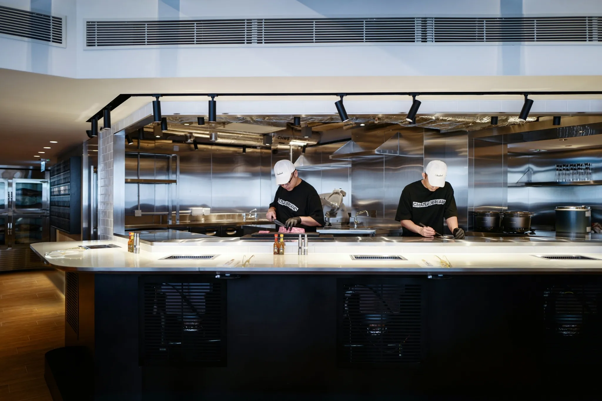 The interior of this new restaurant is filled with olive-grey hues and natural wooden tones in a way that resembles an airport, which owner Hisato Hamada means as an ode to moving forward and new departures. Within the pleasant space is a standing counter – perfect for those who want a quick lunch, or to get up-close to the chefs – and numerous booths, all of which are equipped with smokeless grills.