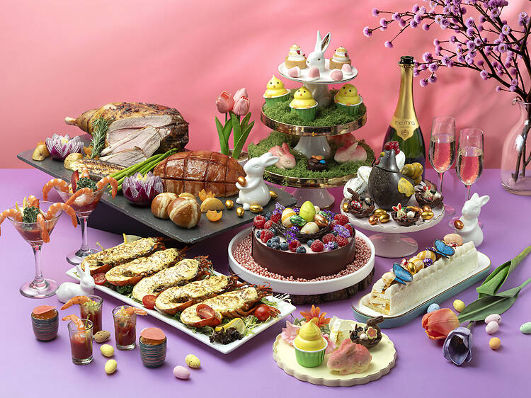 Upstairs, the restaurant is serving two Easter-exclusive brunch specials as part of its all-day set menu: a soft shell crab burger with Korean-style sweet chilli glaze ($228 per set) and a butter-poached lobster Benedict on a toasted croissant ($288 per set). Save room for the plated version of the hot cross doughnut, served warm with salted caramel sauce and vanilla ice cream ($88), or let the kids get hands-on with the DIY Easter shortbread cookies ($168), which come with frosting and toppings for decorating.