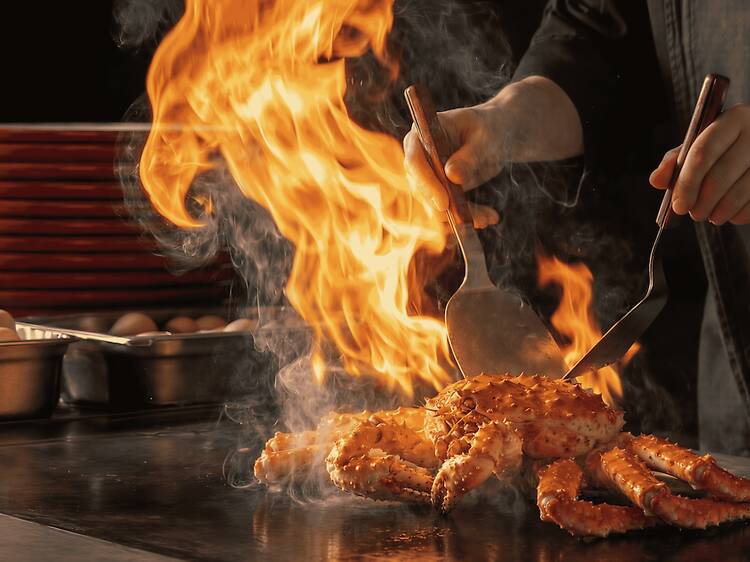 Pull up a seat at Hibi Teppanyaki and watch as the chefs fire up the grill in front of your eyes. This spacious Japanese restaurant in Tsim Sha Tsui whips up several premium seafood dishes, such as crab-filled croissants, lobster in sea urchin sauce, and pan-fried Hiroshima oysters with bacon and sakura ebi. For a lavish dining experience, Hibi Teppanyaki also offers an Alaskan king crab teppan meal set, which presents multiple crab courses, including steamed crab with yuzu and crab leg tempura, along with premium sashimi cuts. Still got room for more? Don’t miss the restaurant’s decadent desserts, ranging from timeless Japanese options like red bean dorayaki to Western delights such as caramel toast.