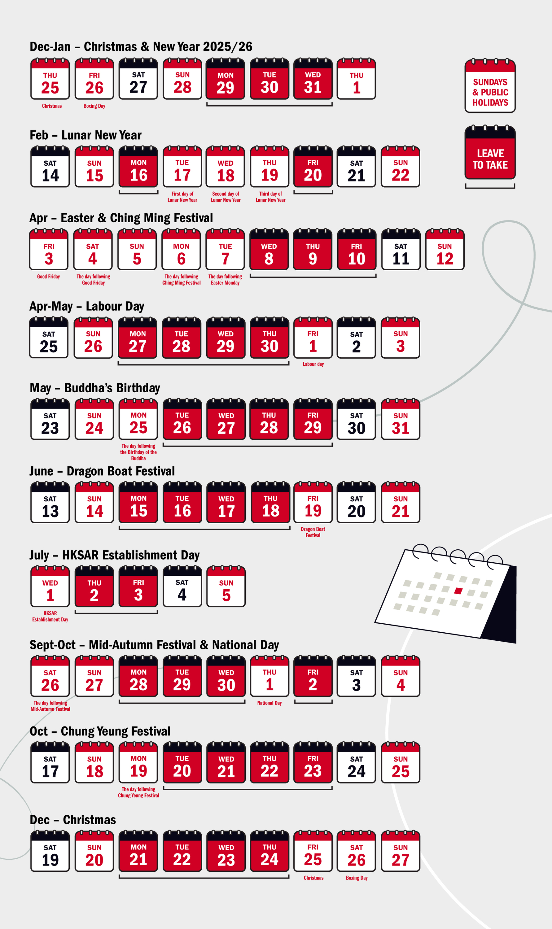 One of the major things we love about living in Hong Kong is that, like so many other best-of-both-worlds instances we get to enjoy, our city celebrates a wonderful mix of both Western and traditional Chinese festivities – which of course means a good number of public holidays each year (17 days, to be exact). With some clever planning, you can make the most of your annual leave, so read on for our handy guide on which days you should take off around the weekends and public holidays of 2026 to maximise your breaks like a pro!