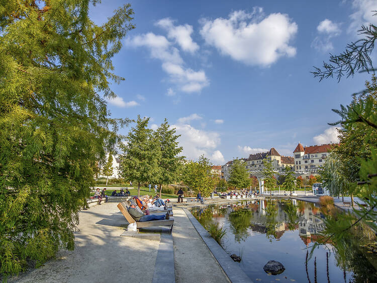Mert egyszerre modern városi park és jól használható menedék a környék nyüzsgése elől. A tópart, a lankás domboldal és a sokféle növényzet miatt akkor is működik, ha csak leülnél egy kicsit, de akkor is, ha egy rövid séta kedvéért ugranál be. Tavasszal különösen látványos, amikor a cseresznyefák virágba borulnak, és a park egy rövid időre egészen más hangulatot kap.