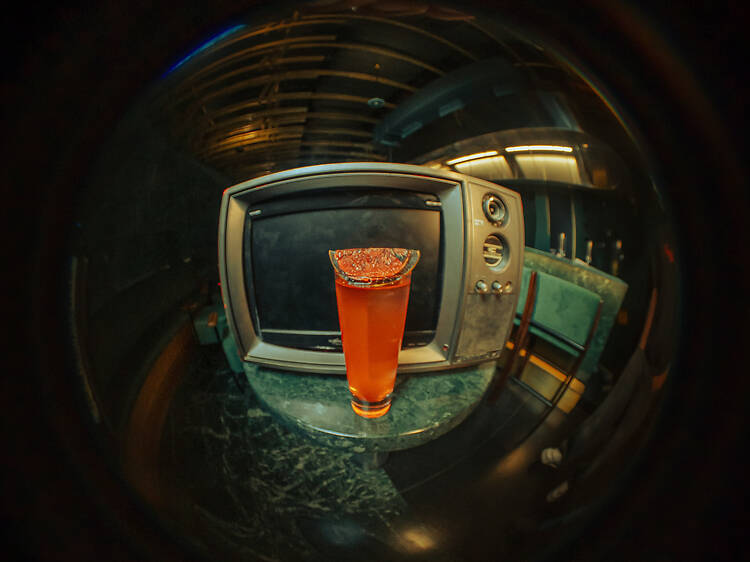Designed by Sona Reddy Studio, the space is dressed in a deep bottle green layered with curtains, a bamboo labyrinth ceiling installation, retro-tech menu fonts, vintage TVs looping grainy visuals and neon-style typographic projections. Their purist approach extends to the techno-house music they play, at a time when most places lean heavily into pop and Bollywood.