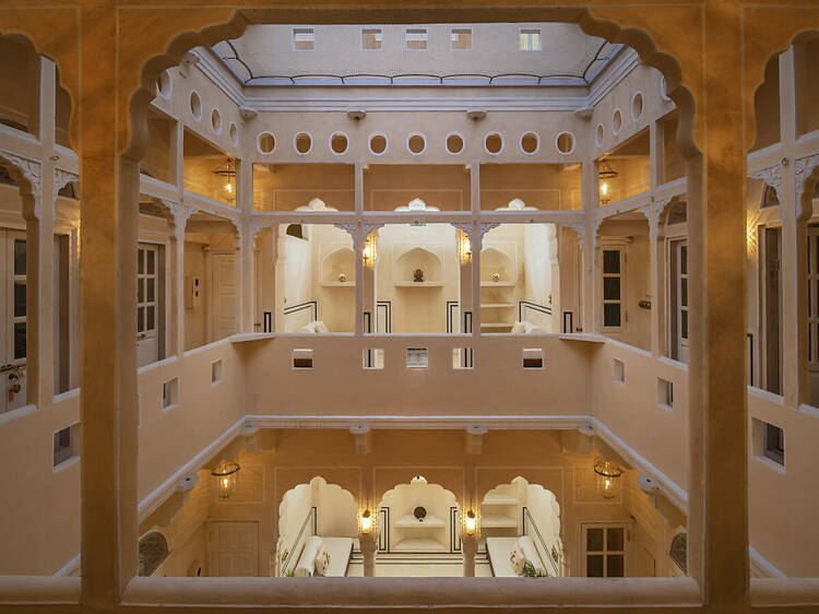 Why go: Staying here very much feels like cosplaying the invited guest of a well-heeled relative. The haveli itself is true-blue authentic Rajasthani – cusped arches, carved jharokhas, old-school jaalis and all – a layout that harks back to Jaipur’s earliest days as a planned city. The location’s another perk. While it does have a sanctuary-like feel despite being located in one of the busiest parts of town, there’s an unexpected joy in stepping out early and watching the city wake, with shopkeepers lifting shutters, sweeping storefronts, and arranging their wares before crowds arrive.
