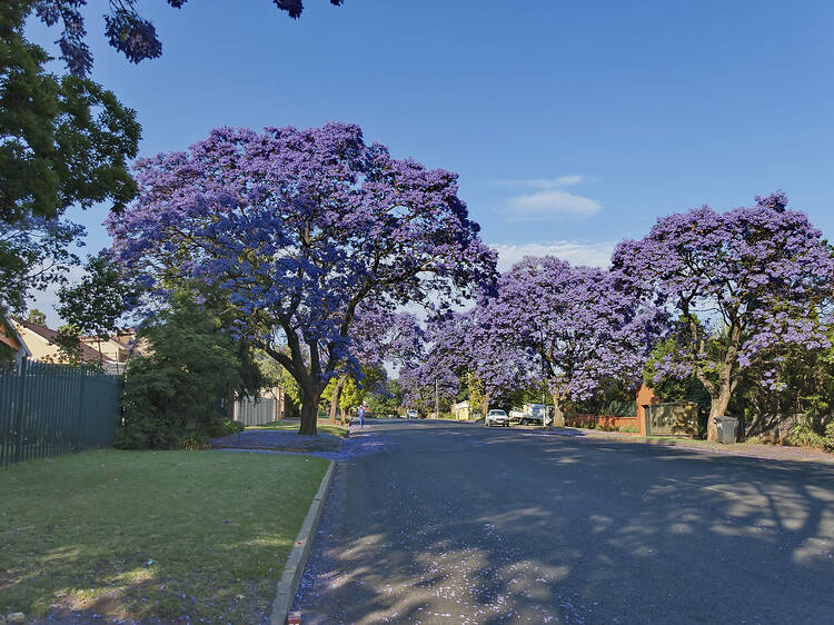 While jacarandas are scattered across the city, a few neighbourhoods truly put on a show. Wander down Parks Road and Oxford Road in Rosebank, Upper Houghton, or The Valley Road in Westcliff for postcard-worthy views. Melville's 4th Street offers a laid-back backdrop framed by purple blossoms and vintage cafés, perfect for a slow brunch beneath the trees.