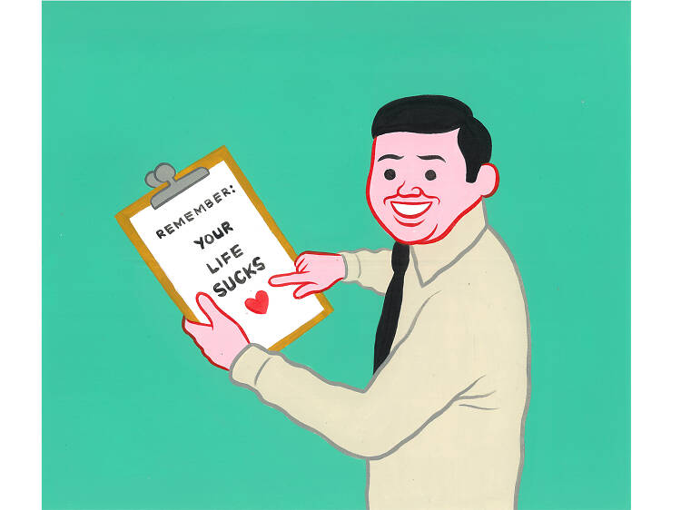 These are surreal, grotesque, vicious non-sequiturs; visual gags with offensive punchlines. But when you look at a painting that says ‘remember: your life sucks’, at least you know you’re not alone. There’s some comfort in that, really.