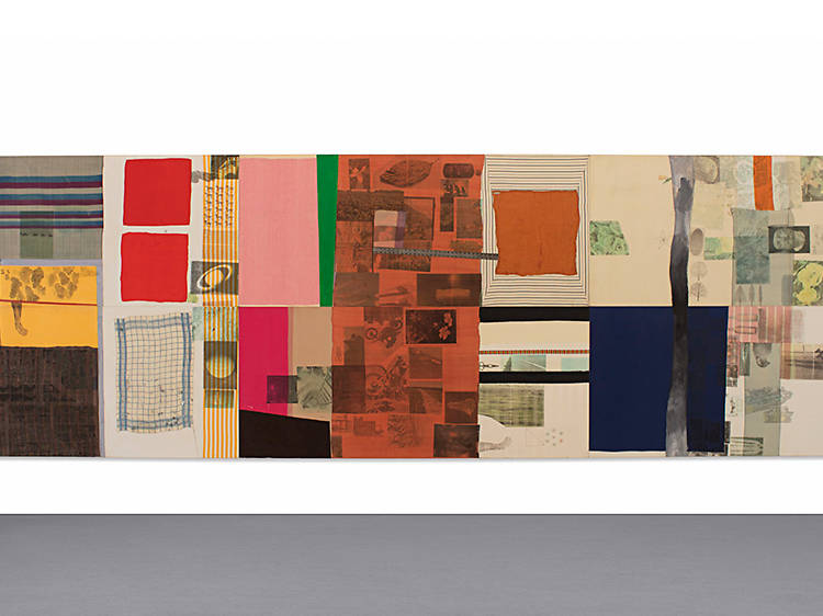 It sounds like a mess, but it isn’t. Rauschenberg fuses these elements together into something that somehow ends up making sense: they’re proper visual compositions, stealing from everywhere, including his own past. The six-metre long ‘Clipper’ – a panoramic vista of fabric, pink paint and blue nature images – reads like a short story. One work drapes down onto the floor, another folds in half like a cupboard.