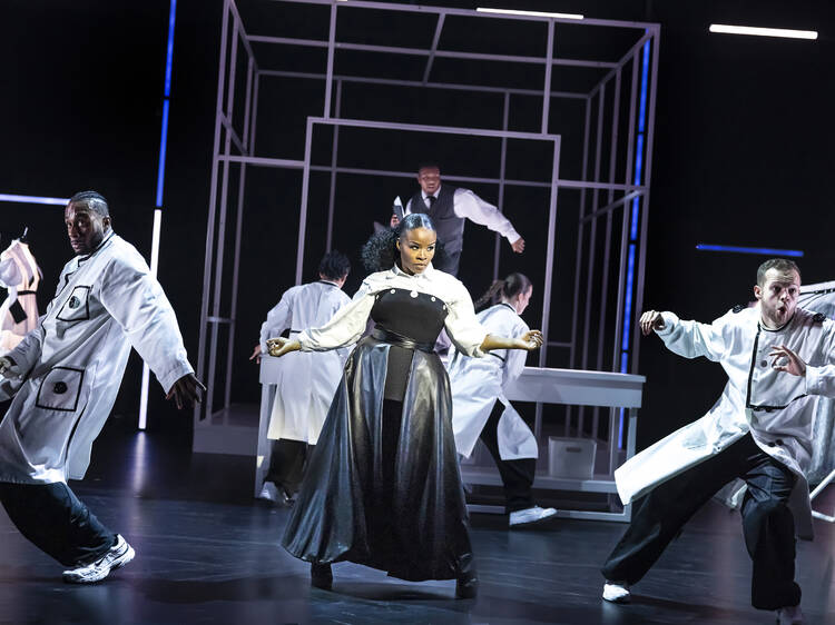 The set is sparse, with a grid of neon lights lining the stage. The rest of the vibes are created by a clever mixture of atmospheric lighting, projections and moving boxes that create different ‘rooms’. Natalie Pryce’s costumes are colourful and fierce, and feature a streetwear take on office garb, OTT fashun silhouettes, and a few obligatory Christmas jumpers.